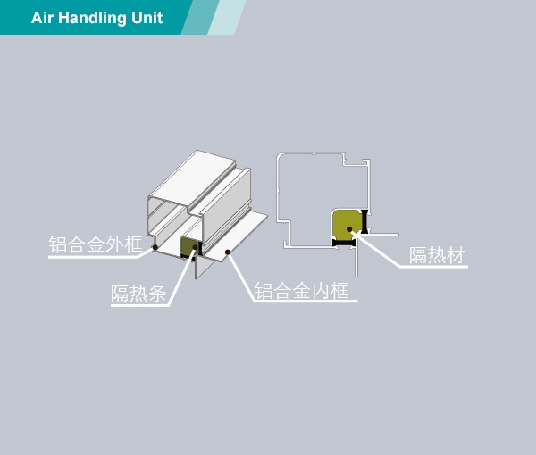 亿万28新一代MAH组合式空气处理机,艾洛斯(Aiolos)系列,采用防冷桥铝合金框架结构设计,面板与框架为压扣连接方式。